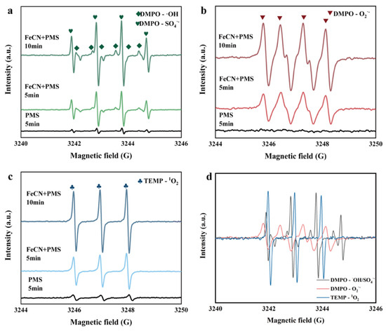The EPR spectrum of SO4•− and •OH (a), O2•− (b), 1O2 (c), The intensity increase of ROS from 5 to 10 min (d).