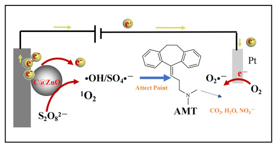 As shown in Figure 4b, compared to the EC system using only the C@ZnO anode, the CZ-PS system exhibited a significantly enhanced AMT removal rate. Within 120 min, the system containing only PS degraded 37.8% of AMT. The degradation performance of the electrocatalytic system with the 200 C@ZnO anode increased markedly. As the PS concentration increased from 0.1 mM to 0.7 mM, the removal rate rose from 60.2% to 100%. This can be attributed to the direct oxidation of AMT on the C@ZnO anode and the oxidation by reactive species (ROS) generated via hydrolysis [34]. Since the generated reactive species adsorb onto the anode, the removal rate in the CZ-PS system increased to 97.5% within 120 min after adding PS. Notably, elevated PMS concentrations may result in suppressed pollutant removal efficiency, attributed to the scavenging of generated ROS [36,37]. This phenomenon indicates a significant synergistic effect when PS is combined with electrochemical oxidation.