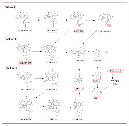 To further reveal the primary transformation products formed during AMT degradation in the C@ZnO anode/PS system, UPLC–MS/MS was employed for their identification. As can be seen from Figure 9, the degradation of AMT primarily proceeds through three distinct pathways, involving a total of 13 intermediates. Sequential demethylation and hydroxylation reactions initially modify the AMT molecule, yielding intermediates Product 1, Product 2, and Product 3 [42]. Subsequently, the dimethylamine moiety in Product 3 undergoes further demethylation and oxidative transformations, generating Products 4 and 5 [44]. Finally, Product 13 is formed via the cleavage of side chains from both Product 4 and Product 5, completing the degradation cascade. Then, Product 6 and Product 7 are formed via continuous ring-opening and hydroxylation reactions attacked by ROS; the seven-membered ring of the AMT molecule is opened through oxidation and hydroxylation, generating intermediate Product 9 [45]. The alcoholic hydroxyl group in Product 9 is continuously oxidized to an aldehyde, forming Product 10 and Product 11. Product 11 can also react with ·OH and sulfate radicals SO4•− to yield Product 12. Subsequently, Product 11 and Product 12 undergo aldehyde oxidation and alcoholic hydroxyl oxidation reactions, respectively, forming Product 13, where the aldehyde is further converted into a carboxyl group; Product 6 and Product 7 are also obtained through the cleavage of the side chain from Product 3. These aromatic intermediates are then further oxidized and mineralized into small molecules (such as NO3−, H2O, and CO2) via continuous ring-opening and hydroxylation reactions attacked by ROS.