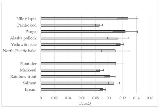 For health-conscious consumers, one of the most desirable foods is fish. The chemical composition of raw fish is as follows: 0–0.5% carbohydrates, 16–21% protein, 1.2–1.5% minerals, 0.2–25% fat and 66–81% water. The muscle tissue is a source of long-chain omega-3 polyunsaturated fatty acids (n-3 LC-PUFA), amino acids, fat-soluble vitamins (A and D) and essential elements such as calcium, zinc and iron. As these compounds are frequently absent from diets leading to various health problems, even in developed countries [1,2,3], dieticians often recommend increasing the share of fish in the diet, both for preventive purposes and for treating diet-related diseases, such as diabetes [4,5]. Although fish are a valuable source of nutrients, they also absorb pollutants from their environment (polycyclic aromatic hydrocarbons, polychlorinated biphenyls, dioxins, microplastics, lead, cadmium, arsenic and mercury). Many of these pollutants demonstrate high persistence, biomagnification, bioaccumulation and non-biodegradability in food chains; as such, they can have considerable negative effects on aquatic ecosystems [3,6,7,8]. After consumption, the compounds acquired from fish can accumulate in the tissues and internal organs of the human body, with various positive and negative effects: The essential trace elements are needed for the activity of various enzymes, while the toxic elements can act as cofactors, initiators or promoters of various diseases. Considering the adverse, and even harmful, effects of certain elements on the human body, food safety organizations, such as the FAO, are introducing oral reference doses for most heavy metals and metalloids in food. The US EPA (Environmental Protection Agency) has developed an Integrated Risk Assessment program aimed at protecting human health from contamination from various sources [9,10,11]. Various factors are also introduced to determine consumer risk associated with consuming contaminated products (e.g., EDI, EWI, THQ, TTHQ, PTWI, BMDL, etc.). This complicates the analysis of results and contributes to inconsistent health risk assessments. Furthermore, combinations of elements can have synergistic or antagonistic effects, potentially resulting in a significantly higher impact [12,13,14].