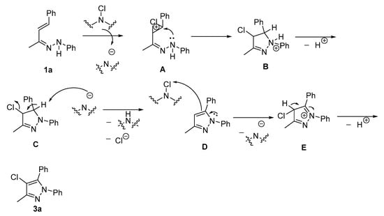 Based on the experimental results and literature precedents [35], a plausible reaction mechanism is proposed (Figure 2). Initially, the chloramine moiety of oxidant TCCA reacts with hydrazone 1a, generating intermediate A alongside an amide anion. Intermediate A undergoes intramolecular cyclization to form B. Subsequent deprotonation of this intermediate yields C. Under the influence of the amide anion, C undergoes dechlorination (elimination of Cl−) to form a double bond, affording D. D is further oxidized by TCCA to cationic intermediate E, which finally undergoes deprotonation to afford the target product 3a.