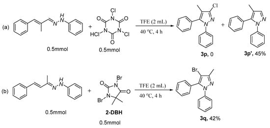 Furthermore, in order to obtain more pyrazole derivatives, (E)-1-((E)-2-methyl-3-phenylallylidene)-2-phenylhydrazine was employed as a substrate to form the corresponding chloropyrazole, while the expected chlorinated product 3p was not detected, and the cyclization product 3p’ was obtained in a 45% yield (Scheme 1a). Meanwhile, bromocyclization of 1a using 2-DBH as a replacement for TCCA afforded brominated pyrazole 3q (Scheme 1b).