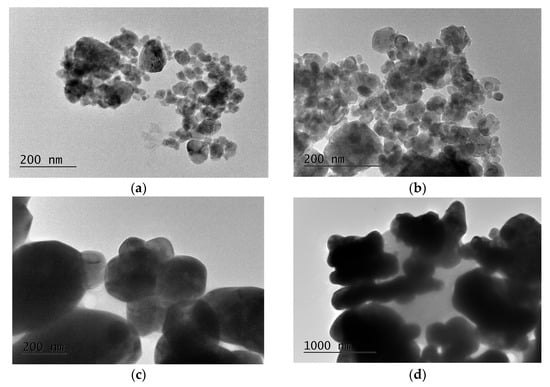 Both the mechanical activation and thermal treatment greatly impacted the particle morphologies of the final products. Figure 2 displays TEM images of the CoWO4 samples that were synthesized with a 5 h milling time at a milling speed of 850 rpm (a and b) and through the solid-state reaction (c and d). The TEM images, at low (a; ×25,000) and high (b; ×40,000) magnifications, show the spherical particle morphologies, with slight agglomerations; this morphology is typical of samples obtained using the ball milling process. The TEM images presented in Figure 2a,b illustrate that the particle sizes range from 10 to 30 nm. This particle form is similar to that established in other materials prepared by mechanochemical treatments [25,27].
