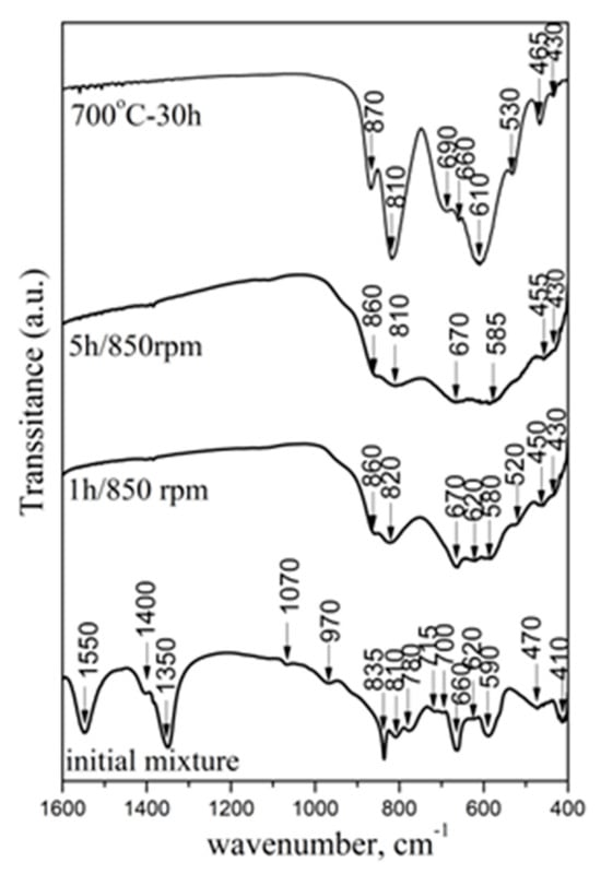 The phase formation of CoWO4 was confirmed using IR spectroscopy (Figure 3). The IR spectrum of the initial mixture exhibits absorption bands typical of both reagents. The bands at 970, 810 and 780 cm−1 were due to the vibration of the W-O-W bridges of WO6, used in building the crystal structure of WO3 [37]. The absorption bands above 1000 cm−1 (bands at 1550, 1400, 1350 and 1070 cm−1) are attributed to the ν3 and ν1 stretching vibrations of the (CO3)2− groups. The vibration of the ν2 (835cm−1) and ν4 bending modes of the same units (at 715, 620, 660 and 590 cm−1) were also registered [38,39].