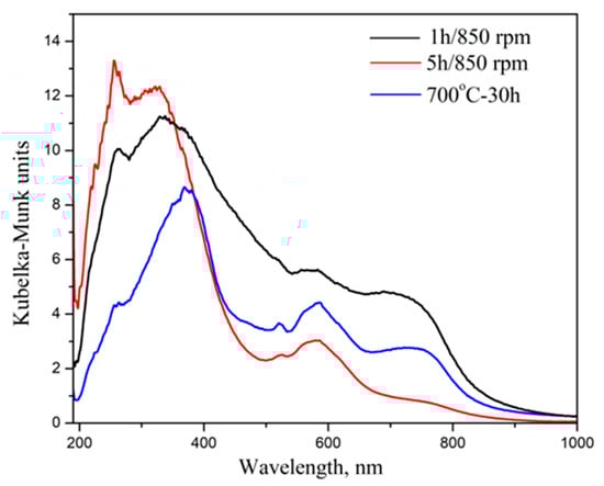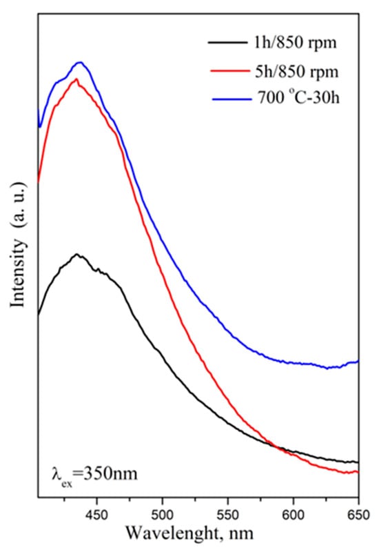 The study of optical properties is important in informing LED applications; UV–vis absorption is directly related to the energy bandgap of the crystal phase. The optical characteristics of the CoWO4 samples obtained through mechanochemical treatment and the solid-state reaction were studied by measuring diffuse reflectance and through photoluminescence spectroscopy. The diffuse reflectance spectra were transformed into a Kubelka–Munk function; the results are shown in Figure 4. The Kubelka–Munk spectra of all the samples exhibit an absorption band in the UV range from 250 to 370 nm and in the visible range from 515 to 760 nm. The peaks in the first range are a result of the charge transfer from oxygen to tungstate atoms in WO6 units [12,14,21]. It was noted that the intensity of the peak at 255 nm is higher than that for the CoWO4 sample that was obtained after 5 h milling time at 850 rpm. The shape and position at the second peak, 330 nm, were changed for the other samples. The band position shifted up to 370 nm for the sample synthesized at using the solid-state reaction (700 °C for 30 h); for this sample, the peaks at the higher wavelengths (515, 580 and 740 nm) have good resolutions and have higher compound intensities. The first peak at 515 nm is due to the following electron transfer: Co (3d) → W (5d) [12]. The absorption peaks at 580 nm and 740 nm are typical of forbidden d–d transitions in Co2+ ions in CoO6 octahedral units [11,12,40].