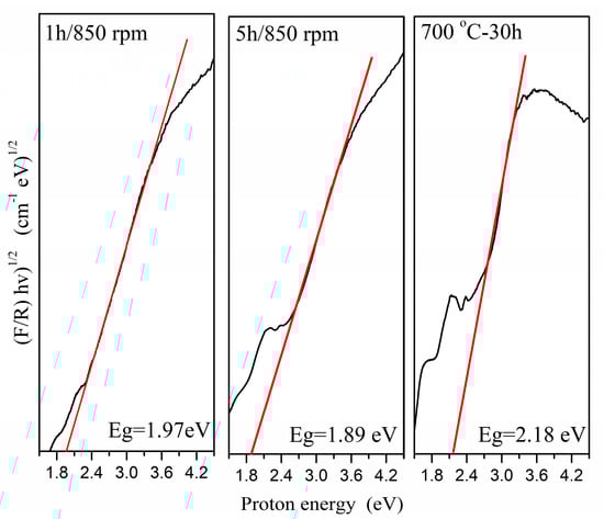 The optical bandgap (Eg) is one important parameter that can be used to forecast the suitability of these materials for optoelectronic applications in semiconductor materials. The optical bandgap can be estimated based on Tauc’s equation; the results are presented in Figure 5. From the figure, it is clear that the CoWO4 powders prepared by ball milling have a relatively lower bandgap value than the CoWO4 samples obtained using a solid-state reaction and the other methods reported in the literature [4,5,7]. Annealing reduces defects in structures, amplifying the nature of the crystals and increasing the crystallite size (Table 1). This is probably the explanation for the higher value of the optical bandgap. The reduced optical bandgaps of the samples obtained through mechanochemical methods can be attributed to their smaller crystallite size and to the formation of defects in their structures. The short reaction time of the CoWO4 formation (1 and 5 h), with a milling speed of 850 rpm, led to the production of structural defects (Table 1); as a result, the electron concentration increases. This leads to the presence of some localized electronic states near the conduction band. Therefore, mechanochemical treatment is directed to the crystal phase with a lower optical bandgap. In this case, we establish that the crystallite size and defects can be considered as the major factors in the value of the optical bandgap.