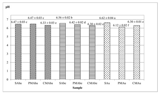 The pH of the beverages is presented in Figure 2, and is in the range of 6.12–6.62. The beverages produced from unmalted seeds are characterized by a higher pH, with the highest obtained by the SAu sample (6.62). Similar pH results for soy beverages were obtained by Zhao et al. (pH = 6.70) [24] and Ikya et al. (pH = 6.57) [25] In beverages from malts, the pH is lower and ranges from 6.12 (PMAu) to 6.47 (PMAba) (Figure 2). The pH of beverages from caramel-type malts has not differed significantly (6.30–6.33), and their pH is lower than beverages from Pilsener-type malt (except for PMAu). According to Briggs [4], various Maillard reaction products formed during drying of the caramel-type malt are characterized by a lower pH; therefore, it is not surprising that beverages produced from them also share the same property.