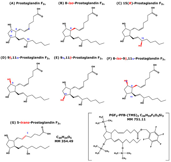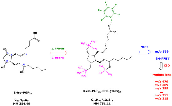 2-Isoprostanes have been analyzed in biological samples by GC-MS or GC-MS/MS as pentafluorobenzyl (PFB) ester trimethylsilyl (TMS) ether derivatives (PFB-TMS) in the NICI mode (