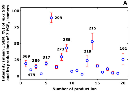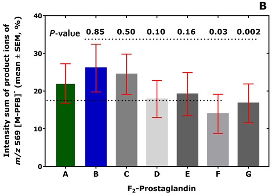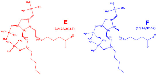 In general, higher specificity of eicosanoid analysis is achieved by quantitative GC-NICI-MS/MS analysis in the selected reaction monitoring (SRM) mode, even in the case of coelution of derivatives. Given the high chemical similarity of the F