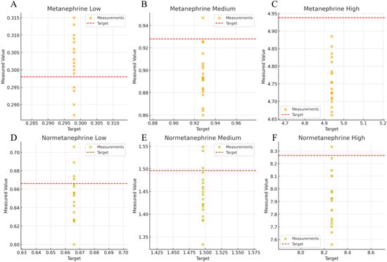 Scatter plot of Metanephrine and Normetanephrine across low, medium, and high concentrations. (A) Low concentration, metanephrine; (B) Medium concentration, metanephrine; (C) High concentration, metanephrine; (D) Low concentration, normetanephrine; (E) Medium concentration, normetanephrine; (F) High concentration, normetanephrine.