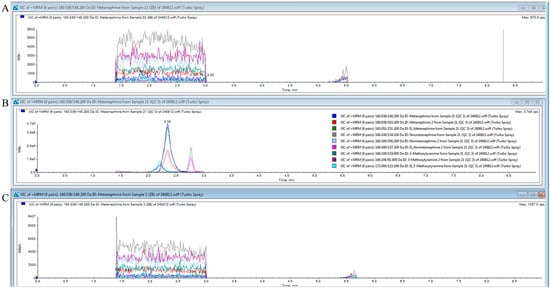 Chromatograms of blank samples before and after analysis. (A) shows the chromatogram of the blank before analysis, (B) shows the chromatogram of the high-concentration control, and (C) shows the chromatogram of the blank after analysis.