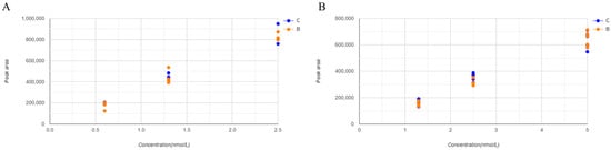 Low- and high-level control samples were also used. To evaluate within-run precision, low (0.30 nmol/L) and high (4.94 nmol/L) concentration controls were measured for five days. To examine the between-run precision, two levels of control samples were measured in the morning and afternoon (time interval of >4 h) for 5 days. The accuracy of both evaluations was within 100 ± 15%. The CV was set to <20%.