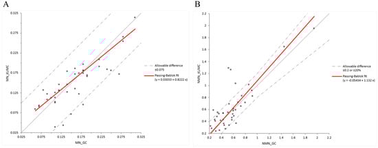 Interlaboratory comparison of metanephrines using Passing–Bablok regression. (A) shows metanephrine and (B) shows normetanephrines. The grey solid line represents the line of identity (y = x), indicating perfect agreement between the two methods.