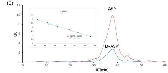 The molecular weight and purity of the polysaccharides were analyzed using high-performance gel permeation chromatography [39], combined with high-performance liquid chromatography (LC-10 A, Shimadzu, Kyoto, Japan), utilizing BRT102 and 104 Gel Columns (8 mm × 300 mm) from Borui Saccharide, Biotech. Co., Ltd. (Yangzhou, China), with an exclusion range of 0.5–400 kDa. The elution process was conducted using a 0.2 M NaCl solution at a flow rate of 0.8 mL/min with detection performed at 40 °C by a refractive index detector (Shimadzu RI-10A). Both ASP and D-ASP samples were prepared at 7 mg/mL and centrifuged at 12,000 rpm for 10 min. The supernatant was filtered using a 0.45 μm microporous filter, and 20 μL of the filtrate was injected for analysis. A calibration curve was generated using a series of dextran standards with molecular weights ranging from 11,600 to 667,800 Da.