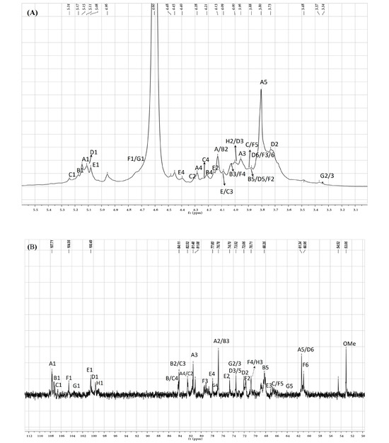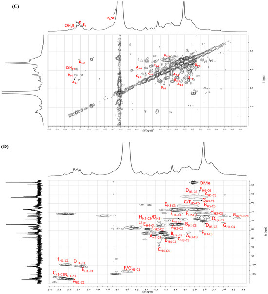 To further clarify the sequences of sugar residues in ASP polysaccharide, 1D NMR (1H NMR, 13C NMR) and 2D NMR (COSY, HSQC, and HMBC) were analyzed to attribute all C/H chemical shifts combining the literature and are summarized in Table 2. As shown in Figure 5A,B, eight anomeric proton and carbon signals were anatomized. In the 13C NMR spectrum of ASP, the strong signals at 107.7, 107.3, and 107.1 ppm were attributed to Araf-(1→ (A), →5)-Araf-(1→ (B), and →3,5)-Araf-(1→ (C) residues, respectively. The signals in the anomeric region of the 1H NMR spectrum of ASP (Figure 5A) were assigned based on the COSY (Figure 5C) and HSQC spectrum (Figure 5D). Signals at 5.14, 5.17, and 5.24 ppm were allocated to H1 of Araf-(1→ (A), →5)-Araf-(1→ (B), and →3,5)-Araf-(1→ (C) residues corresponding to the C-1 signals at 107.7, 107.3, and 107.1 ppm, respectively. In the range of δ 104–103 ppm, the signals at 103.1 and 103.2 ppm belonged to →4)-Galp-(1→ (F) and →4)-Xylp-(1→ (G) sugar residues. The signals at 4.78 and 4.58 ppm were set to H-1 of →3)-Galp-(1→ and →4)-Xylp-(1→ corresponding to the C-1 signal at 104.5 and 103.2 ppm. At the district of 100 ppm, two signals at 100.5 and 100.2 were assigned to 1→4)-GalpA-(6-OMe)-(E) and →4)-Glcp-(1→ (D, corresponding to the H-1 signals at 5.03 and 5.12 ppm, respectively. For the residue of Araf-(1→ (residue A), the starting resonance was H1 (5.14 ppm); then, the chemical shifts of H2 (4.13 ppm), H3 (3.96 ppm), H4 (4.23 ppm), and H5 (3.80 ppm) were all labeled in the homonuclear correlation spectroscopy spectrum (Figure 5C) corresponding to C2–5 signals that were appointed in the HSQC spectrum (Figure 5D). All the other signals are listed in Table 2. Featured C/H signals of the groups CH3COO–, MeO–, and MeC appeared at 20.3/2.18, 53.03/3.88, and 16.7/1.35 ppm [21]. The low-field signal at 171.0 ppm in the 13C NMR spectrum suggested the appearance of a carboxyl group in uronic acid.
