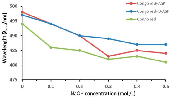 Maximum absorption wavelength of Congo red–polysaccharides (ASP and D-ASP) at various concentrations of sodium hydroxide for a triple-helical structure.