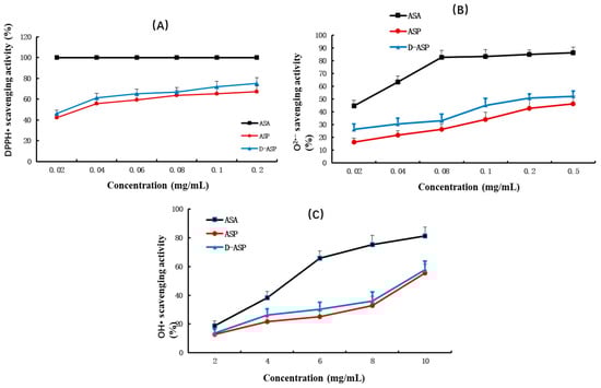 Antioxidant activity assay of ASP and D-ASP. (A) DPPH• radical scavenging assay; (B) superoxide anion scavenging activity assay; (C) hydroxyl radical scavenging ability assay; values are means x ± SD, n = 3.