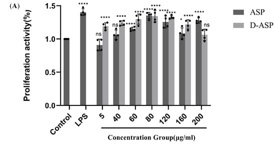 Cell-counting kit-8 assay was employed to assess cell proliferation [46]. Logarithmically growing cells were diluted to a concentration of 1 × 105 cells/mL, and 100 μL of this suspension was added to each well of a 96-well plate. To minimize edge effects, 100 μL of phosphate-buffered saline (PBS) buffer was added to the wells along the perimeter of the plate. The plate was incubated at 37 °C in 5% CO2 for 24 h. For the experimental group, ASP and D-ASP solutions were added to achieve final concentrations of 5, 40, 60, 80, and 120 μg/mL. Each concentration was tested in triplicate wells, and the plate was incubated for 36 h. The control group received no drug treatment, while the positive control group was treated with lipopolysaccharide (LPS) at a final concentration of 2.5 μg/mL. After 36 h, the supernatants were removed, and 100 μL of medium containing 10% cell-counting kit-8 solution was added. The plate was incubated for one additional hour, after which the optical density at 450 nm was measured using a microplate reader. The cell proliferation rate was then calculated using the following formula 3 (Supplementary S4).