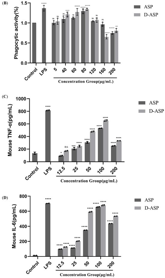 The phagocytic activity of RAW 264.7 macrophages was assessed using a neutral red staining method [46]. Cells in the logarithmic growth phase were prepared into a cell suspension at a density of 4 × 105 cells/mL. A volume of 100 μL of the suspension was seeded into each well of a 96-well plate with 100 μL of PBS added to the peripheral wells to prevent edge effects. The plate was then incubated at 37 °C in a 5% CO2 atmosphere for 24 h. For controls, no treatment was applied to the negative control group, while LPS (final concentration: 2.5 μg/mL) was added to the positive control group. The experimental groups received ASP and D-ASP solutions, which were adjusted to final concentrations of 5–200 μg/mL. Each concentration was tested in triplicate wells, and cells were incubated under the same conditions for an additional 24 h. After incubation, the supernatant was discarded, and cells were washed twice with PBS following the kit instructions. Next, 100 μL of medium containing 10% neutral red solution was added and incubated for 1 h. Afterward, the cells were washed twice with PBS again, and 100 μL of cell lysate was added, which was followed by further incubation for 2 h. The optical density (OD) was measured at 540 nm using a microplate reader, and the macrophage phagocytic index was calculated using formula 4 (Supplementary S4)