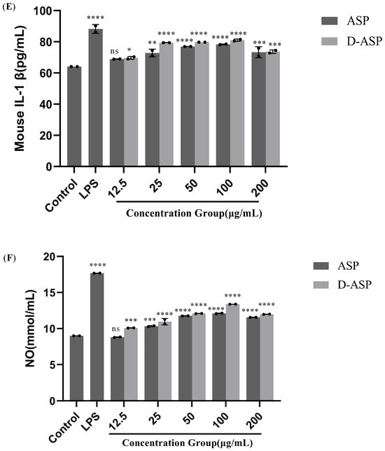 RAW 264.7 cells were plated into 96-well plates at a density of 1 × 106 cells per well and treated with ASP and D-ASP polysaccharides at varying concentrations (12.5–200 μg/mL) for 48 h. Cells treated with medium alone served as the blank control, while cells treated with 2.5 μg/mL LPS were used as the positive. Following incubation, the culture supernatants were collected to measure the levels of interleukin-6 (IL-6), tumor necrosis factor-alpha (TNF-α), and interleukin-1 beta (IL-1β) using mouse precoated ELISA kits (Dakewei Bio-engineering Co., Ltd., Shenzhen, China) as per the manufacturer’s instructions.