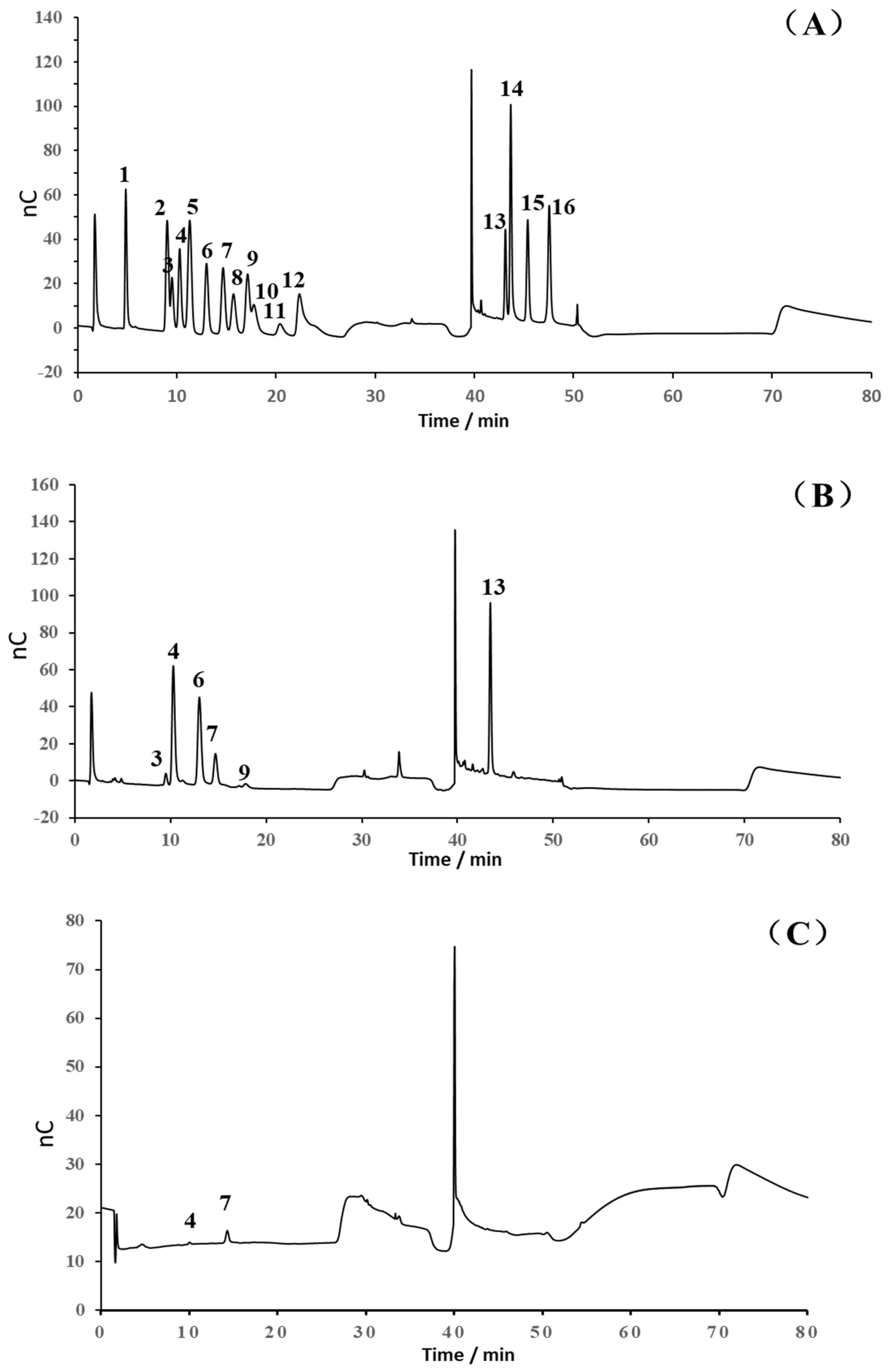 - Liu, D.; Tang, W.; Yin, J.-Y.; Nie, S.-P.; Xie, M.-Y. Monosaccharide composition analysis of polysaccharides from natural sources: Hydrolysis condition and detection method development. Food Hydrocoll. 2021, 116, 106641. [Google Scholar] [CrossRef]