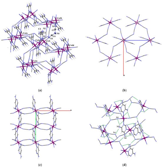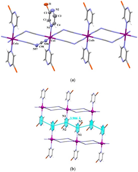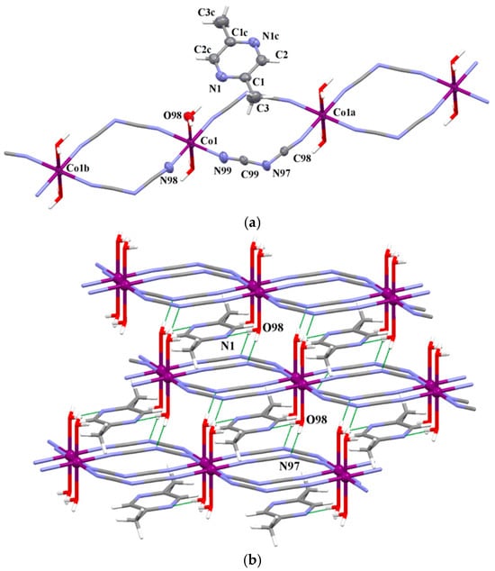 (a) View of a fragment of the linear chain [Co(μ–1,5–dca)2(H2O)2]2 alternating with 2,5-Me2pyz molecules in the structure of 6. Displacement ellipsoids are drawn at 50% probability level [Symmetry code: (a) = 1 + x, −1 + y, z; (b) = −1 + x, 1 + y, z (c) = −x, −3 − y, −z]. (b) A view of the 3D crystal packing of 6 generated through O–H···N hydrogen bonds.