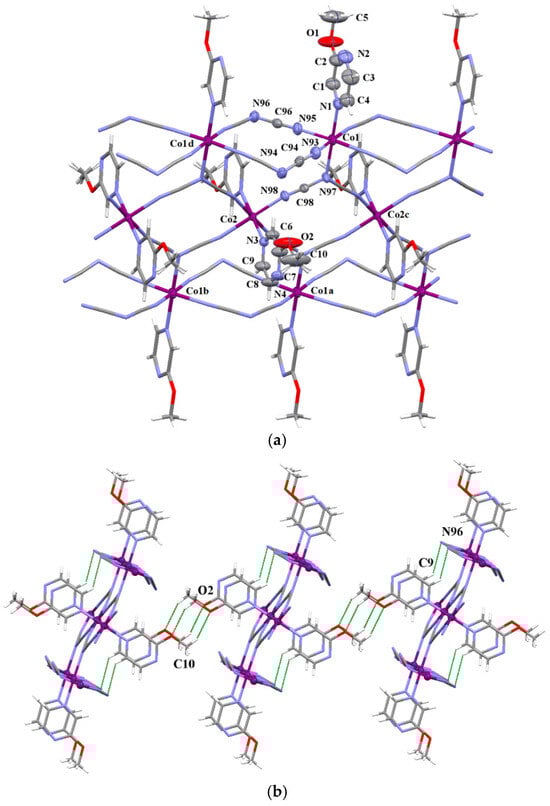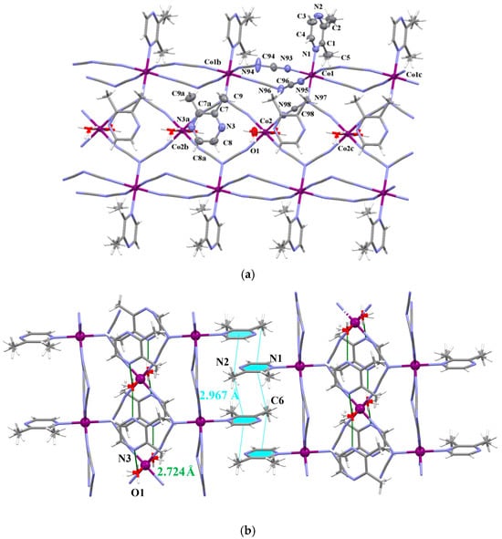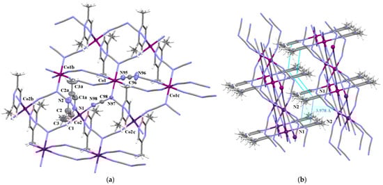 The structure of 7 consists of triple neutral chains of formula [Co3(dca)6(2,3–Me2pyz)2(H2O)2]n alternating with uncoordinated 2,3-dimtehylpyrazine (Figure 5). By analogy to 4, the Co(1) atoms in 7 are six-coordinated in a somewhat distorted octahedral surrounding which is defined by four nitrile nitrogen atoms of μ1,5–dca groups in the equatorial sites [Co–Ndca = 2.134(3) and 2.092(3) Å] and two nitrogen atoms of μ1,3,5–dca and 2,3–Me2pyz filling the axial positions [Co–Ndca = 2.237(3) Å and Co–Lpyz = 2.232(3) Å]. In contrast to 4, the Co(2) ions are in a CoN4O2 environment, with four equatorial nitrile–nitrogens of μ1,3,5–dca ligands [Co–Ndca = 2.158(3) Å] and two axial oxygen atoms of water molecules [Co–Ow = 2.029(3) Å]. The SHAPE values of the environments of Co(1) and Co(2) with respect to the OC-6 stereochemistry are 0.221 and 0.247, respectively (see Figure S10). Owing to large steric demands of methyl groups, 2,3–Me2pyz molecules do not coordinate directly to the Co(2) atoms, but they participate in the formation of hydrogen bonds with water molecules [O(1)–H(1)•••N(3b) with D•••A = 2.724(3) Å and D–H•••A = 167.3°; symmetry code: (b) = x, 1 − y, z]. The Co(1)•••Co(1b) Co(1)•••Co(2) and Co(2)•••Co(2b) separations are 7.4913, 6.1363, 7.4913 Å, respectively. The crystal packing analysis through the Mercury 2.4 program [39] revealed that the neighboring triple chains are assembled by weak C–H•••π stacking interactions into a supramolecular 2D structure (see Figure 5b and Table S7).