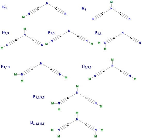 Amongst others, intense research efforts have been devoted to CPs based on Co(II) and dicyanamide (dca–, N(CN)2−) ions. The research in this field has been focused on the exploration of structure–magnetic behavior relationships, essential for rational synthesis of molecule-based magnets with pre-defined properties [16,17,18,19,20,21,22]. Regarding structural aspects, the pseudohalide anion dca–, with a boomerang shape and three potential nitrogen donor sites (two nitrile and one amide), is a remarkably versatile ligand with multiple coordination modes (Scheme 1), while the cobalt(II) center can exhibit a diversity of stereochemistries, including octahedral, tetrahedral, square-pyramidal, trigonal-bipyramidal, square-planar and pentagonal bipyramidal [23,24].