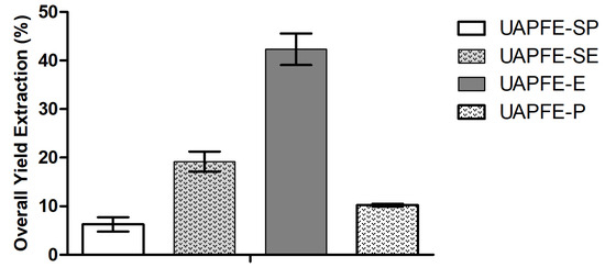 The OEY obtained with UAPFE-E (42.3 ± 3.2%) was significantly higher than that achieved with UAPFE-P (10.2 ± 0.31%). This finding indicates that the ethanol/water solvent system is markedly more effective than propane under the evaluated conditions. This superiority was consistently observed in both single-step extractions (30 min per solvent) and sequential extractions. Sequential extractions yielded 16.2 ± 3.0% for UAPFE-SE and 6.3 ± 1.5% for UAPFE-SP, both performed for 15 min per solvent, totaling 30 min. A comparison between the ethanol/water-based sequential extraction (UAPFE-SE: 16.2 ± 3.0%) and its one-step counterpart (UAPFE-E: 42.3 ± 3.2%) revealed that the single-step method produced a significantly higher yield. This result suggests that a continuous 30 min extraction with the ethanol/water blend may facilitate more efficient solubilization and recovery of overall compounds than a sequential extraction using two solvents with distinct polarities.