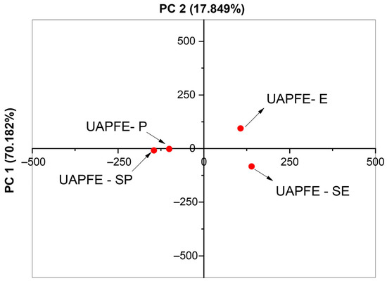 As shown in Figure 2, the PCA score plot (PC1 ~70%) revealed distinct clustering of samples, indicating differentiation based on chemical composition. Samples extracted with the same solvent were grouped together, reflecting compositional similarity. Furthermore, the second principal component (PC2 ~18%) highlighted the impact of the sequential process, particularly on ethanolic extracts. This is evidenced by the greater Euclidean distance between UAPFE−E and UAPFE−SE compared to the distance between UAPFE−P and UAPFE−SP, suggesting a more pronounced chemical shift induced by the sequential ethanol extractions.