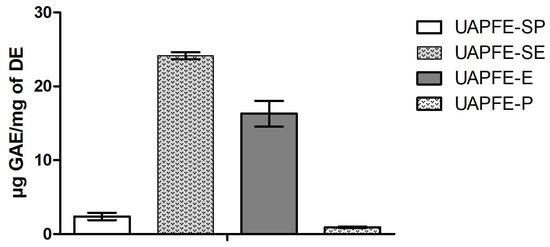 The TPC varied significantly depending on the solvent system and the extraction process (sequential vs. one-step UAPFE), ranging from 0.9 to 24.1 μg gallic acid equivalents (GAE) per mg of DE (Dry extract). The highest concentrations were observed in extracts obtained using ethanol/water (80:20, v/v), specifically in UAPFE-E and UAPFE-SE, while the lowest concentrations were found in UAPFE-P and UAPFE-SP (Figure 3). These results indicate that the ethanol/water mixture was significantly more effective than propane (UAPFE-P and UAPFE-SP) in extracting TPC from the vegetable blend.