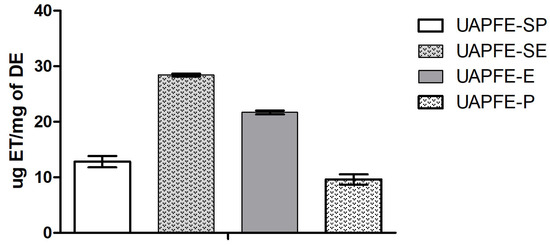 Based on the results obtained, the UAPFE-SE extract exhibited significantly greater antioxidant activity (28.5 ± 0.3 μg ET/mg of DE) compared to the single-step extraction using the same solvent (UAPFE-E: 22.0 ± 0.2 μg ET/mg of DE). A similar trend was observed for the propane extractions, where the sequential method (UAPFE-SP: 12.0 ± 1.0 μg ET/mg of DE) showed considerably higher antioxidant activity than the single-step extraction (UAPFE-P: 9.0 ± 0.4 μg ET/mg of DE).