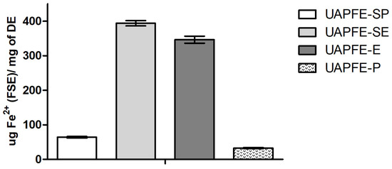 The antioxidant potential of the vegetable blend extracts obtained by UAPFE was evaluated through FRAP analysis (Figure 5). Based on the results in Figure 5, the sequential UAPFE-SE extract showed the highest FRAP values (394.0 ± 6.0 µg Fe2+/mg of DE) compared to the direct UAPFE-E extraction (346.5 ± 7.0 µg Fe2+/mg of DE) using the same solvent. Similarly, with propane, the sequential UAPFE-SP extract (64.0 ± 4.1 µg Fe2+/mg of DE) also yielded significantly higher values than the direct UAPFE-P extract (30.2 ± 2.1 µg Fe2+/mg of DE).