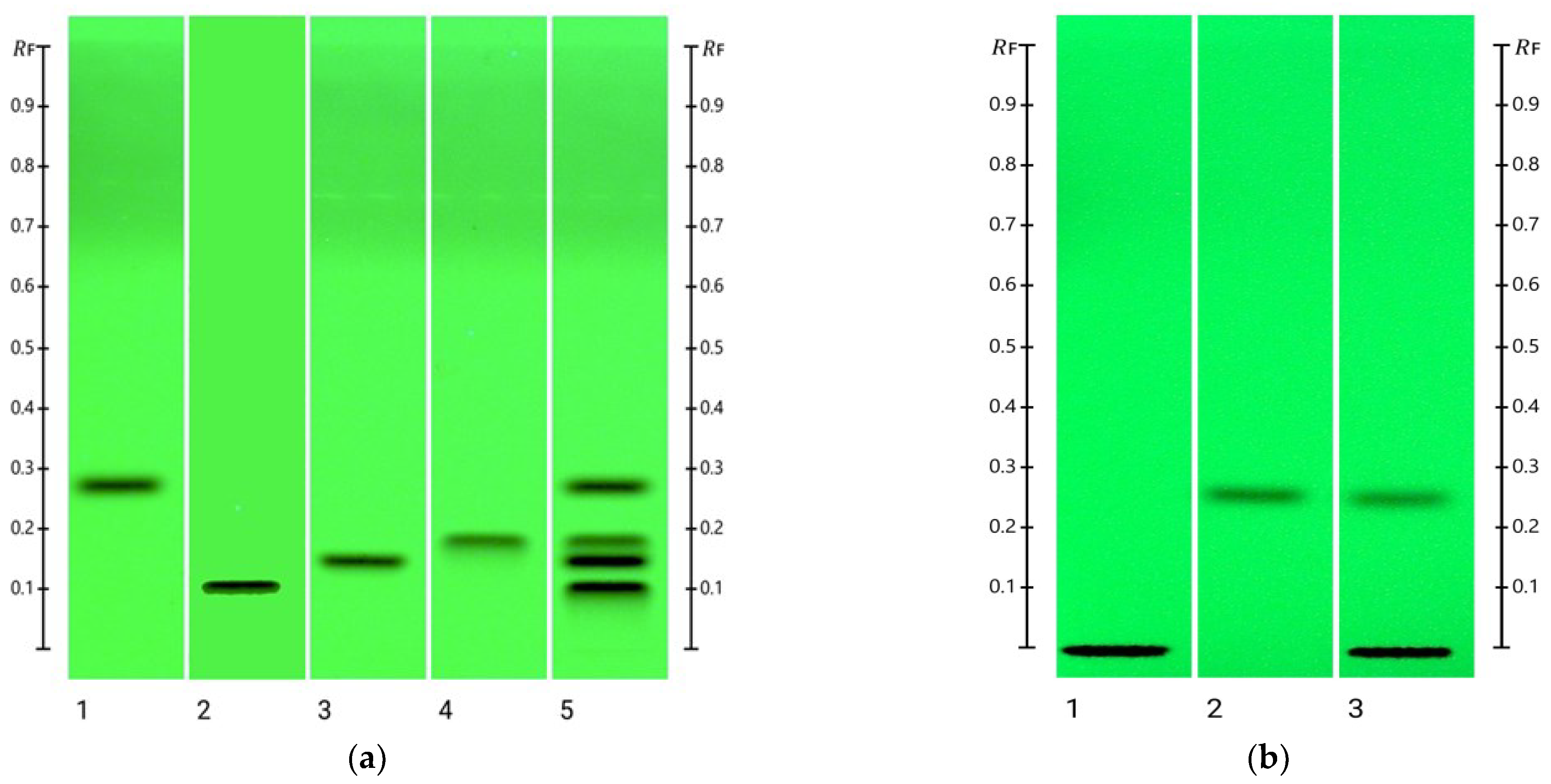 - Ruddy, D.; Sherma, J. Analysis of the caffeine in alertness tablets and caplets by high-performance thin-layer chromatography with ultraviolet absorption densitometry of fluorescence-quenched zones. Acta Chromatogr. 2002, 12, 143–150. [Google Scholar]
