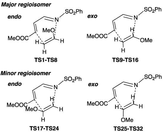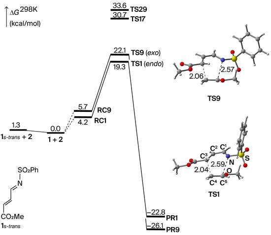 In the case of 1″, the free energies of the lowest energy endo and exo TSs relative to the initial state (1″ +2), i.e., TS1″ and TS9″, are 15.1 and 18.9 kcal/mol, respectively (the energy difference is 3.8 kcal/mol; Figure 4 and Figure S12). Thus, the endo preference in this case (endo:exo = 707:1) was found to be higher than that of 1 and 1′. This result is in agreement with the experimentally observed endo:exo ratio (>20:1) in the reaction between 4-phenyl-2-ethoxycarbonyl-N-(phenylsulfonyl)-1-aza-1,3-butadiene and ethoxyethane [40].