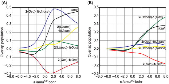 Then, the change in the Mulliken overlap population [48,49,50,51] for the C3−C4 and N−C5 bonds along the IRC was further examined (Figure 2A and Figure 2B, respectively). The population of the C3−C4 bond is slightly negative when s < −1 amu1/2∙bohr and after this increases positively. The decomposition in terms of fragment Kohn–Sham orbitals [47,52] showed that the component between the occupied orbitals of the dienophile fragment and unoccupied orbitals of the diene fragment (2(Occ)−1(Unocc) in Figure 2A) contributes to the increase in the overlap population. Thus, the electron delocalization from the dienophile to the diene plays an important role in the formation of the C3−C4 bond. In contrast, the increase in the overlap population between the N and C5 atoms (s > 0 amu1/2∙bohr) depends largely on the contribution of the unoccupied orbitals of the dienophile fragment and the occupied orbitals of the diene fragment (2(Unocc)−1(Occ) in Figure 2B). This observation indicates that electron delocalization in the direction opposite to the C3−C4 bond formation process is essential for the formation of the N−C5 bond.