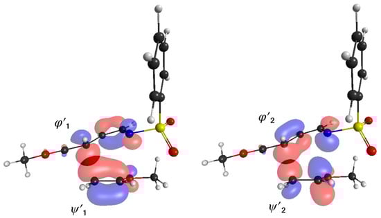 Subsequently, orbital interactions were analyzed in terms of the interaction frontier orbitals (IFOs) [53,54]. One pair of orbitals, (ψ′1; φ′1), is mainly responsible for the electron delocalization from the dienophile fragment to the diene fragment in TS1 (Figure 3). The orbital ψ′1, obtained from the linear combination of the occupied Kohn–Sham orbitals of the dienophile fragment, consists of the π bonding orbital of the C=C bond of the dienophile and the amplitude of the C4 atom is larger than that of the C5 atom. The orbital φ′1, which consists of the unoccupied orbitals of the diene fragment, is similar to the LUMO of butadiene and the amplitude of the C3 atom is slightly larger than that of the N atom. Orbitals ψ′1 and φ′1 have energies of −7.62 eV and −2.05 eV, respectively. The interaction between these two orbitals is important for the C3−C4 bond formation process.