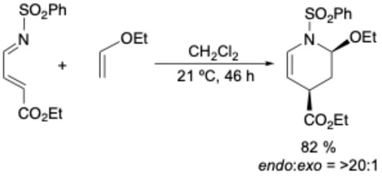 Meanwhile, the inverse-electron-demand Diels–Alder (IEDDA) reaction, which employs an electron-deficient diene and an electron-rich dienophile, has recently emerged as an important tool in both chemical biology and organic synthetic chemistry [36,37,38]. Boger and co-workers have developed IEDDA reactions between N-sulfonyl-1-aza-1,3-butadine and electron-rich dienophiles [39,40]. In the reaction of 4-ethoxycarbonyl-N-(phenylsulfonyl)-1-aza-1,3-butadiene with ethoxyethane, for example, high regio- and endo-selectivity (endo:exo ratio is >20:1) was reported (Scheme 1) [40].