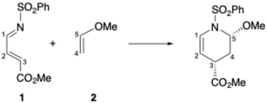 It has been argued that the endo selectivity is a result of not only the interaction between the alkoxy substituent of the dienophile and the carbon atom adjacent to the nitrogen atom in the azadiene, i.e., SOI, but also a result of the n-σ* interaction (or anomeric effect) that arises from the interaction between the lone-pair electron of the nitrogen atom and the σ* orbital of the C-O bond. Therefore, it is of great interest to compare the origin of the stereoselectivity in the IEDDA reaction with that of the NEDDA reaction, although some DFT studies on the stereoselectivity in IEDDA reactions were already reported [41,42,43]. In the present study, we have examined in detail a model reaction between 4-methoxycarbonyl-N-(phenylsulfonyl)-1-aza-1,3-butadiene (1) and methoxyethene (2) to clarify the origin of the selectivity of the reaction (Scheme 2).