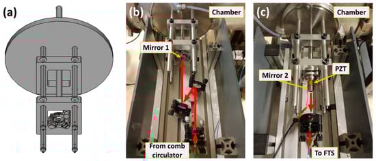 Figure 4a. Each optical cavity mirror was supported by a rigid frame constructed from four 25 cm long, ½″-diameter stainless steel posts directly affixed to the chamber flanges. Two square aluminum plates (10 cm × 10 cm × 2 cm) were mounted on the posts: the first to provide structural reinforcement, and the second to hold the mirror housing itself. Both plates were secured in place with spring-loaded thumbscrews to ensure mechanical stability and alignment.