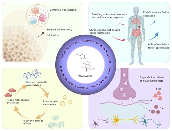 - Liu, Q.; Chen, J.; Zeng, A.; Song, L. Pharmacological functions of salidroside in renal diseases: Facts and perspectives. Front. Pharmacol. 2023, 14, 1309598. [Google Scholar] [CrossRef]