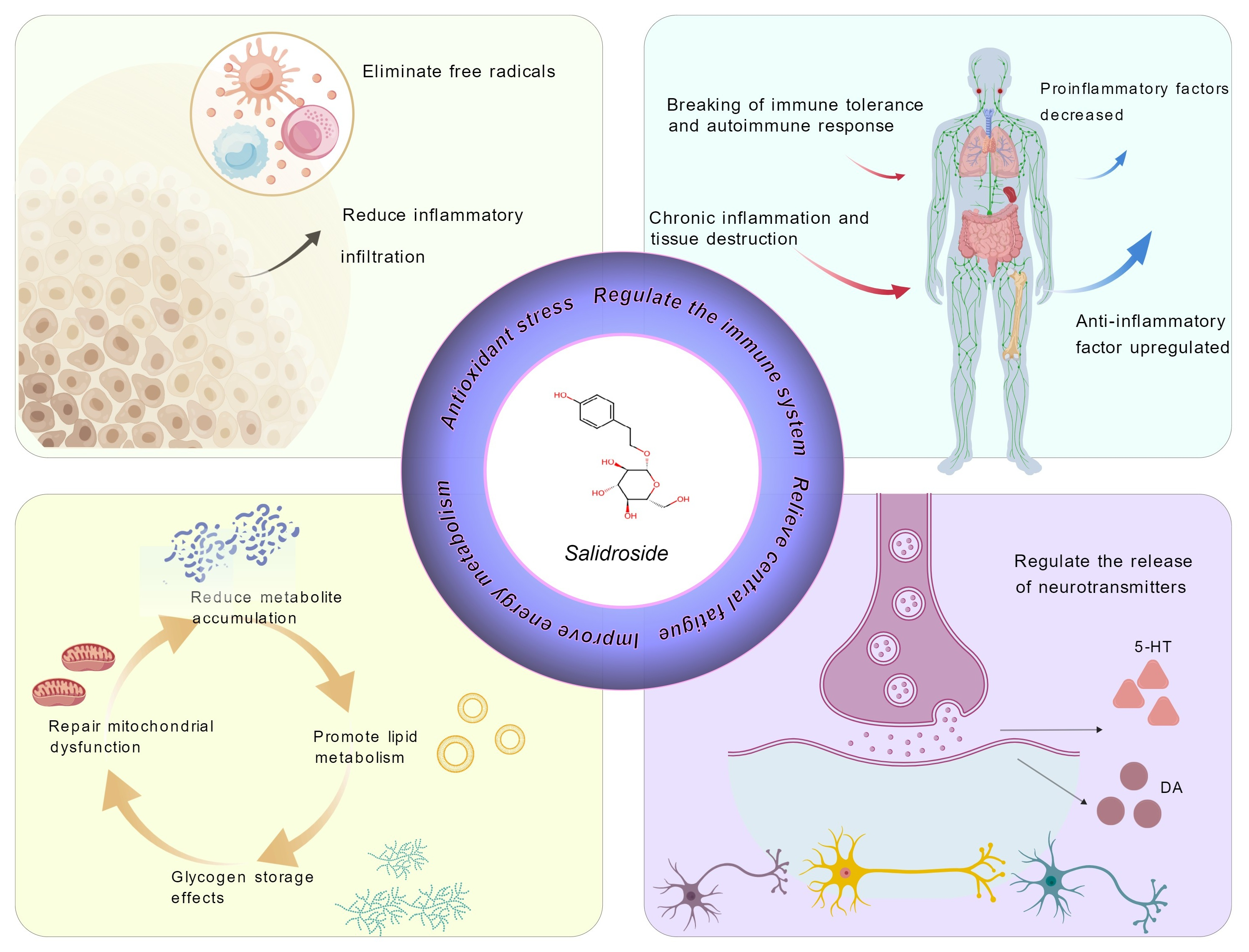 | Reduce metabolite accumulation | Regulating homeostasis dysregulation Reduce oxidative stress damage Reduce oxidative stress, reduce MDA, H2O2 and lactate levels in liver and muscle tissue  | CIA Model Mouse exhaustion experiment  |
