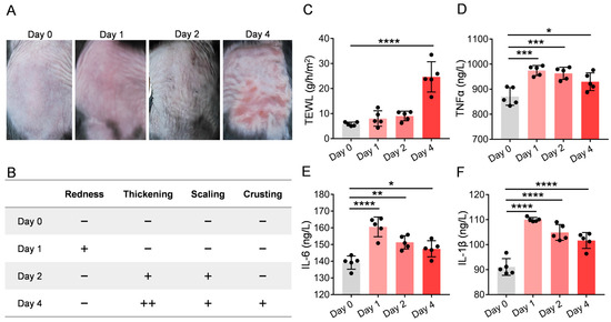 UVB irradiation impact on transepidermal water loss and inflammatory cytokine levels: Mouse skin was irradiated with a UVB dose of 300 mJ/cm2, and measurements were performed on days 0, 1, 2, and 4 post-irradiation. (A) Skin photographs at different time points; (B) Visual observation scores; (C) Transepidermal water loss (TEWL) measurements revealed significantly increased values post-irradiation compared to baseline; (D–F) UVB exposure triggered robust inflammatory responses, with markedly elevated levels of proinflammatory cytokines (TNF-α, IL-6, and IL-1β) compared to non-irradiated controls. Intergroup comparisons were performed using one-way ANOVA followed by Dunnett’s post hoc test comparing all groups to the Day 0 control group. ns, * p < 0.05, ** p < 0.01, *** p < 0.001, **** p < 0.0001. n = 5.