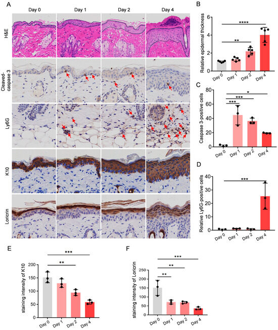 Pathological evaluation of UV-irradiated skin tissue was performed using H&E staining and immunofluorescence at different time points (days 0, 1, 2, and 4) (Figure 2A). H&E staining revealed progressive thickening of the epidermal layer over time following UV irradiation (Figure 2B). Immunohistochemistry staining was employed to label and quantify specific biomarkers, including apoptosis-associated protein (cleaved caspase 3), neutrophil marker (Ly6G), and differentiation marker (K10 and loricrin). The results demonstrated that although epidermal thickening occurred following UVB irradiation, the staining of the epidermal differentiation markers was lighter (Figure 2E,F), indicating that the epidermal barrier was compromised. Cleaved caspase 3-positive cells peaked on day 1 post-irradiation (p < 0.001), followed by a progressive decline (Figure 2C). Neutrophils (Ly6G), as early participants in the inflammatory response, showed a significant increase on day 4 (p < 0.001), indicating the induction of an inflammatory response following UV exposure (Figure 2D).
