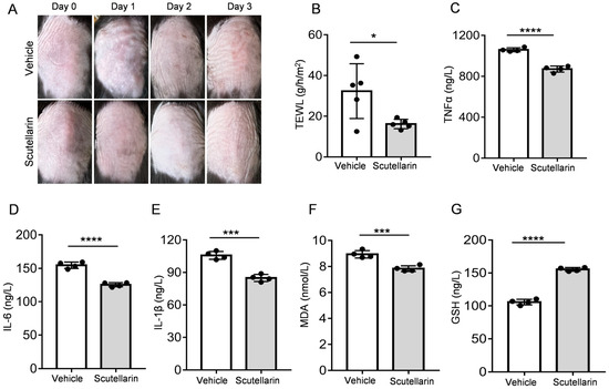 Scutellarein ameliorates TEWL and reduces cytokine production during UVB-induced skin inflammation: (A) Skin photographs at different time points; (B) TEWL (n = 5); (C–E) levels of cytokines based on ELISA: TNFα, IL-6, IL-1β; (F) levels of antioxidant capacity based on ELISA: MDA (G) and GSH levels. Bars represent means ± SEM, n = 4. * p < 0.05, *** p < 0.001, **** p < 0.0001 vs. the vehicle group.