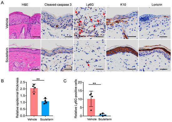 Scutellarin can reduce neutrophil infiltration and maintain barrier integrity: (A) Epidermal thickness was measured in samples collected 72 h post-irradiation using hematoxylin and eosin (H&E) staining, while immunohistochemical (IHC) staining was performed to evaluate cleaved caspase-3, Ly6G, K10, and loricrin. Scale bar: 50 μm. The dashed lines indicate significant changes in epidermal thickness, and the red arrows mark the Ly6G-positive cells. (B) Epidermal thickness quantification; (C) neutrophil infiltration analysis. n = 4. Vehicle vs. scutellarin group. ** p < 0.01.