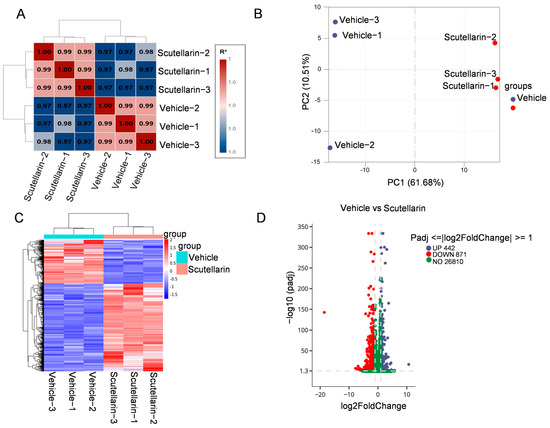 Transcriptomic profiling and differential gene expression in scutellarein vs. vehicle groups: (A) Inter-sample correlation heatmap. Both the x-and y-axes represent the squared correlation coefficients (R2) between samples; (B) PCA; (C) Clustered heatmap of differentially expressed genes (DEGs); (D) Volcano plot of differentially expressed genes (DEGs). The x-axis represents the log2-transformed fold change (log2FC) in gene expression between groups, and the y-axis indicates statistical significance of differential expression (−log10-transformed adjusted p-values, −log10padj). Upregulated genes are denoted by blue dots, while downregulated genes are marked with red dots.