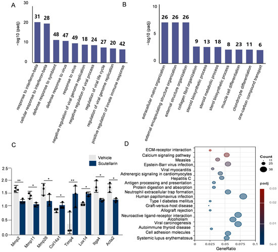 Scutellarein alleviates skin damage by modulating the expression of key regulatory genes: (A) GO enrichment analysis plot of upregulated genes; (B) GO enrichment analysis plot of downregulated genes; (C) Comparison of expression levels of relevant ECM genes between vehicle and scutellarin treatments; (D) KEGG enrichment scatter plot. Vehicle vs. scutellarin group, * p < 0.05, ** p < 0.01, n = 3.