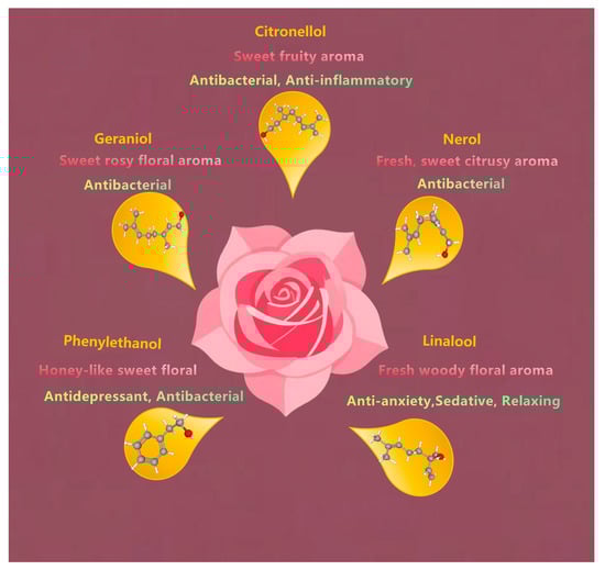 Rose essential oil is a valuable aromatic oil extracted from roses (Figure 1); its composition, however, varies considerably across different rose species [9]. Geraniol (42.08%), heneicosane (22.07%), n-heptadecane (16.70%), and linalool (11.55%) are the main constituents of the essential oil from R. canina flowers [10,11]. The total monoterpenoid content of R. rugosa essential oil is 70.31%, of which the linalool content is 33.73% [6]. In addition, the relative contents of geraniol and citral are relatively high in the four types of rose essential oils [12]. GC-MS analysis identified citronellol and geraniol as the predominant constituents within the essential oil composition, although their relative abundances exhibited significant quantitative fluctuations in response to variations in temperature and precipitation levels [13].