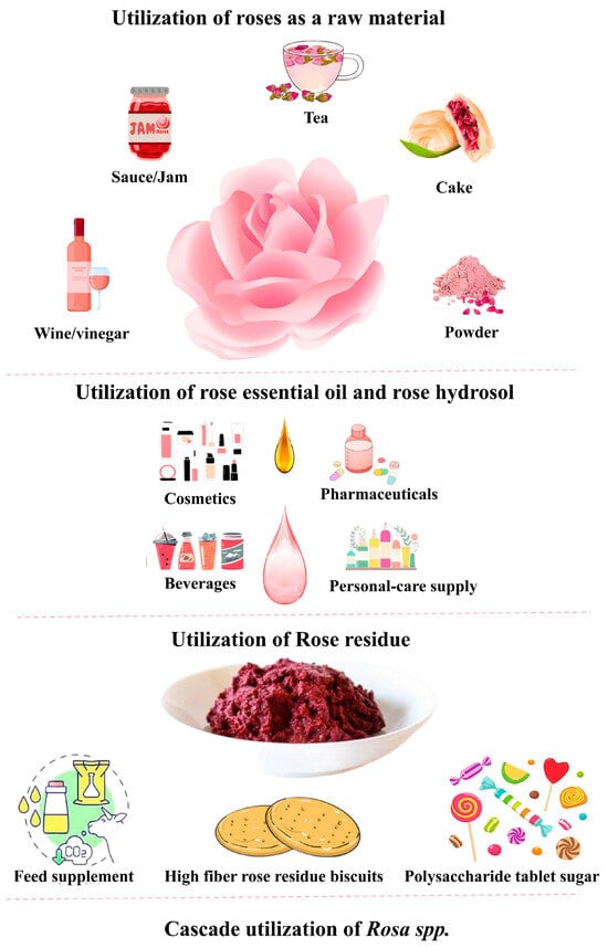 Roses have medicinal, edible, and ornamental value and are increasingly loved by people. Since the raw materials of roses, rose essential oil, hydrosol, and the remaining rose residues contain various bioactive components, a cascading utilization approach has been proposed to maximize the application of this resource (Figure 2).